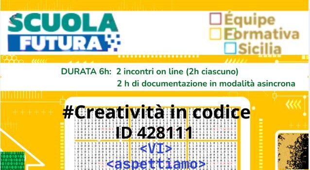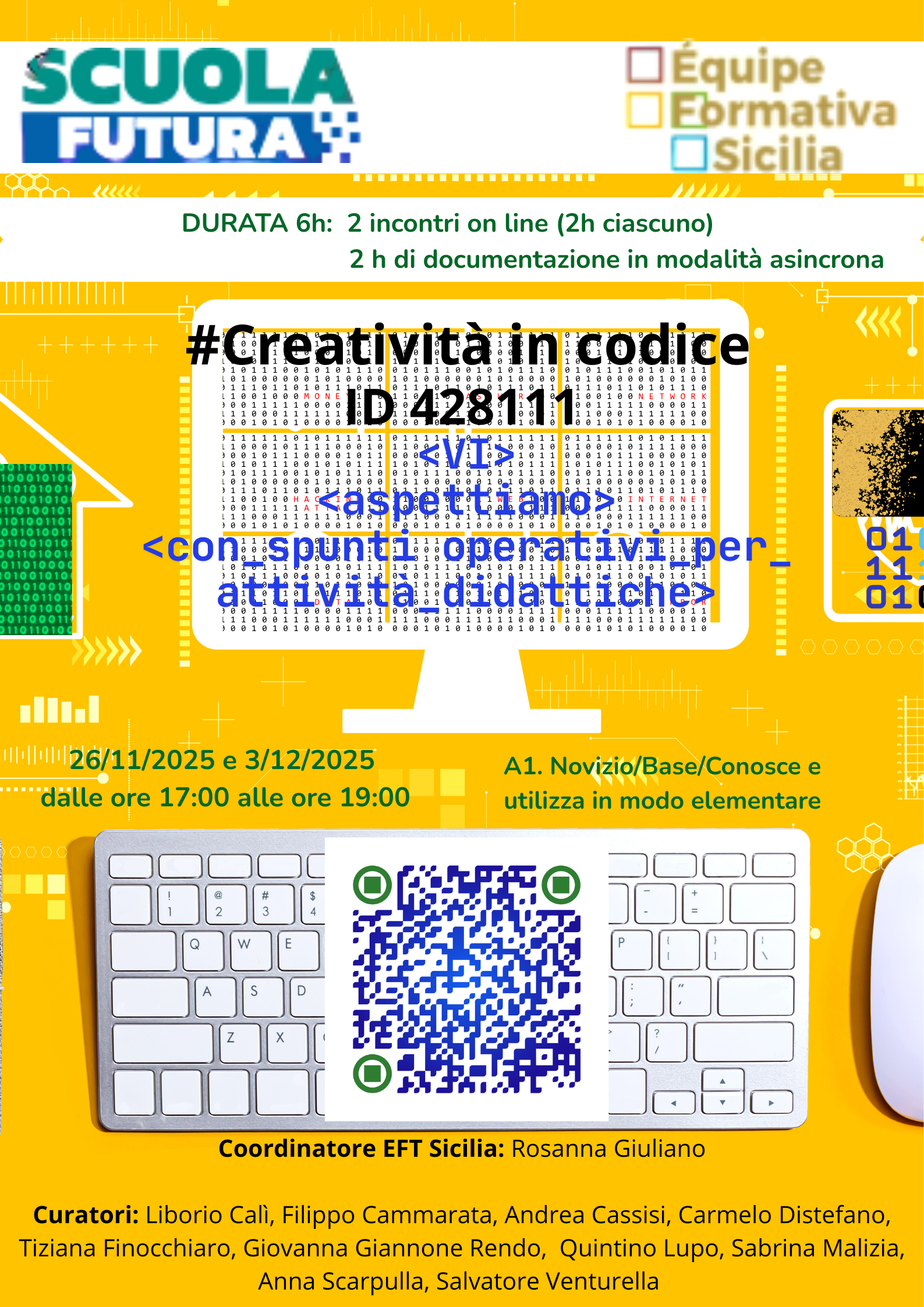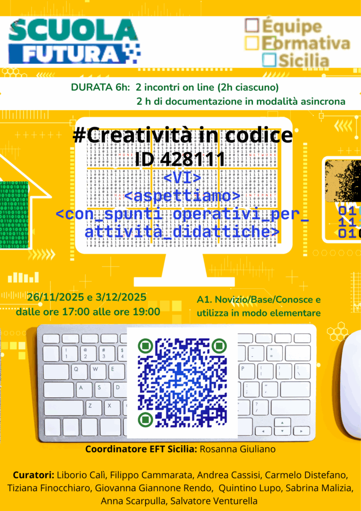 L’Équipe Formativa Territoriale (EFT) della Sicilia ha programmato il percorso “#Creatività in codice”, che prevede due webinar online, dedicati ai docenti di ogni ordine e grado, nelle date 26 novembre e 03 dicembre 2025, dalle ore 17:00 alle ore 19:00. Durante il percorso, saranno esplorate attività di coding creative e interattive per lo sviluppo del pensiero computazionale, facilmente replicabili con gli alunni in classe. La scheda completa del corso è disponibile al seguente link: https://scuolafutura.pubblica.istruzione.it/-creativit%C3%A0-in-codice