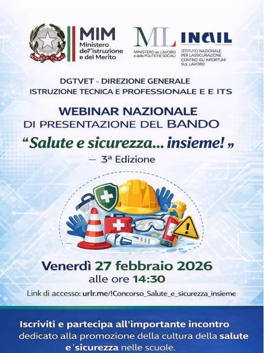 Il bando di concorso “Salute e sicurezza…insieme!” promosso dal Ministero del lavoro e delle politiche sociali, d’intesa con il Ministero dell’istruzione e del merito e in collaborazione con Inail, è giunto alla terza edizione. L’iniziativa, rivolta alle scuole secondarie di secondo grado e agli istituti di formazione professionale (IeFP) del territorio nazionale, mira a diffondere e a promuovere la salute e la sicurezza nei luoghi di lavoro, mediante l’elaborazione di progetti creativi sensibilizzanti alla prevenzione degli infortuni.